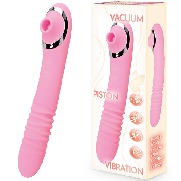 ロング挿入が可能なストレートタイプのピストンバイブの反対側に吸引ローターが搭載された二役アイテム登場です。